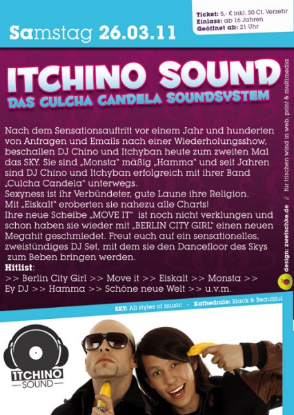 | 26. März 2011 SKY in Passau Itchino Sound @ SKY Das Culcha Candela Soundsystem... Nach dem Sensationsauftritt vor einem Jahr und hunderten von Anfragen und E-Mails nach einer Wiederholungsshow, beschallen DJ Chino und Itchyban heute zum zweiten Mal das SKY. Si sind "Monsta" mäßig "Hamma" und seit Jahren sind DJ Chino und Itchyban erfolgreich mit ihrer Band "Culcha Candela" unterwegs. Sexyness ist ihr Verbündeter, gute Laune ihre Religion. Mit "Eiskalt" eroberten sie nahezu alle Charts! Ihre neue Scheibe "Move it" ist noch nicht verklungen und schon haben sie wieder mit "Berlin City Girl" einen neuen Megahit geschmiedet. Freut euch auf ein sensationelles, zweistündiges DJ Set, mit dem sie den Dancefloor des Skys zum Beben bringen werden. Hitlist: Berlin City Girl Move it Eiskalt Monsta Ey DJ Hamma Schöne neue Welt uvm. |