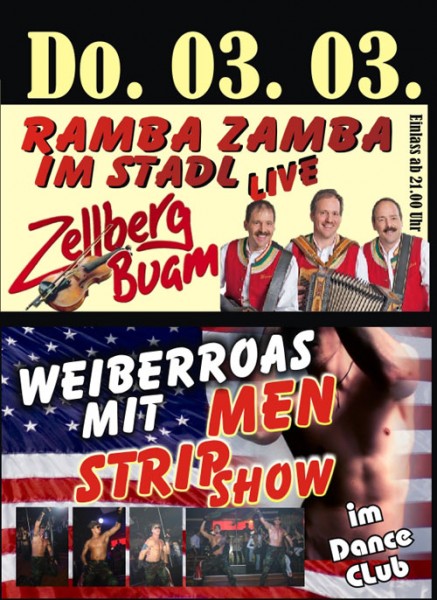 | 03. März 2011 Fun in Eggenfelden Weiberroas @ FUN Ramba Zamba im Stadl: live die Zellberg Buam Specials: - Party in allen Areas - Cocktailbar, Fox-Stadl, Dancehall, Raucherterrasse - Gratis Essen - Menstrip |