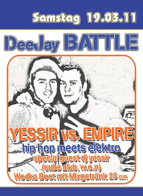 | 19. März 2011 Dj Battle mit Dj Yessir @FUN Cham Yessir vs. Empire hip hop meets elektro Special guest DJ Yessier Specials: Wodka Boot mit Mixgetränk 25 € |