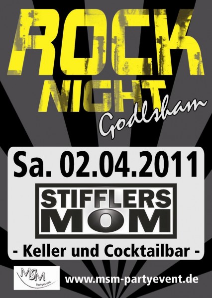 Rock Night in Godlsham mit STIFFLERS MOM Am Samstag den 2. April 2011 verwandeln wir die ehemalige Disco Godlsham ( zwischen Pfarrkirchen und Simbach am Inn ) wieder in eine Rock und Pop Disco, größer, bunter, interessanter und dreht sich alles um Rock. Mit der Band „ STIFFLERS MOM“, die uns mit Pop und Rock beschallen und Party bis zu abwinken bescheren. Und das Beste ist natürlich wieder die Kellerbar mit der legendären Rutsche. . Also bis dann und let´s Rock Euer MSM-Partyevent Team |