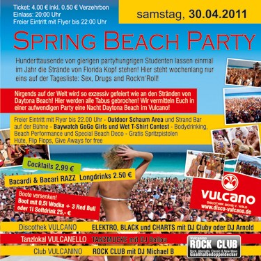 | 30.03.2011 Discothek Vulcano Spring Beach Party @ Vulcano Hunderttausende von gierigen partyhungrigen Studenten lassen einmal im Jahr die Strände von Florida Kopf stehen! Hier steht wochenlang nur eins auf der Tagesliste: Sex, Drugs and Rock'n‘Roll! Nirgends auf der Welt wird so exzessiv gefeiert wie an den Stränden von Daytona Beach! Hier werden alle Tabus gebrochen! Wir vermitteln Euch in einer aufwendigen Party eine Nacht Daytona Beach im Vulcano! Specials: - Freier Eintritt mit Flyer bis 22.00 Uhr - Outdoor Schaum Area und Strand Bar - auf der Bühne - Baywatch GoGo Girls und Wet T-Shirt Contest - Bodydrinking - Beach Performance und Special Beach Deco - Gratis Spritzpistolen, Hüte, Flip Flops, Give Aways for free - Cocktails 2,99 € - Bacardi & Bacari RAZZ Longdrinks 2,50 € - Boote versenken! Boot mit 0,5l Wodka + 3 Red Bull oder 1l Softdrink 25,00 €. |