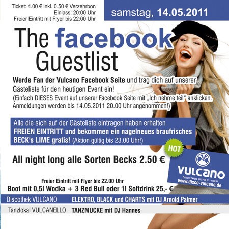 | 14. Mai 2011 Vulcano Aicha v. Wald The facebook GUESTLIST @ Vulcano Werde Fan der Vulcano Facebook Seite und trag dich auf unserer Gästeliste für den heutigen Event ein! (Einfach DIESES Event auf unserer Facebook Seite mit „Ich nehme teil“ anklicken. Anmeldungen werden bis 14.05.2011 20.00 Uhr angenommen!). Alle die sich auf der Gästeliste eintragen haben erhalten - FREIEN EINTRITT und bekommen ein nagelneues braufrisches BECK's LIME gratis ! (Aktion gültig bis 23.00 Uhr! ) - All night long alle Sorten Becks 2.50 € - Freier Eintritt mit Flyer bis 22.00 Uhr - Boot mit 0,5l Wodka + 3 Red Bull oder 1l Softdrink 25,- € |