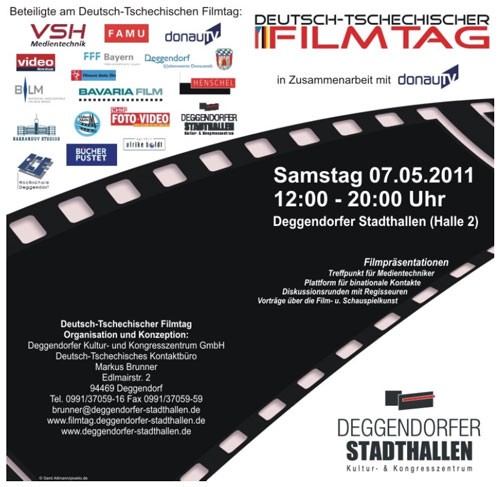 | 7. Mai 2011 DEUTSCH-TSCHECHISCHER FILMTAG Tauchen Sie ein in die Welt der Filme! Am Samstag, den 07.05.2011 dreht sich alles um das "Drehen". Im Mittelpunkt stehen der Austausch von Erfahrungen, Diskussionsrunden sowie Kurzvorträge und Präsentationen. Die Veranstaltung stellt eine Plattform für binationale Kontakte dar und richtet sich an Schüler und Studenten, sowie alle Kamera- und Filminteressierte. Der Eintritt ist FREI! Programmablauf: 12:00 Uhr: Einlass 13:00 Uhr: Offizielle Eröffnung durch die Oberbürgermeisterin der Stadt Deggendorf Anna Eder 13:30 Uhr: Vorstellung des neuen Imagefilms der Stadt Deggendorf 14:00 Uhr: Vorstellung der Film- und Fernsehfakultät der Akademie der musischen Künste in Prag (FAMU) 15:00 Uhr: Vortrag von Ulrike Boldt: Tips, wie man erfolgreich Schauspieler wird 16:00 Uhr: Amateurfilmblock mit Oskar Siebert, Jaroslav Nykl, Michal Pandula und Martin Lánik 18:00 Uhr: Filmvorführung des erfolgreichsten tschechischen Spielfilms aller Zeiten "Leergut" (Spielfilmlänge: 103 Min.) Weiter Infos findest du unter DEUTSCH-TSCHECHISCHER FILMTAG |