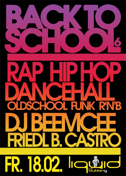 | 20. Mai 2011 BACK TO SCHOOL vol 9 @ LIQUID Hip Hop, Rap, Oldschool Sag mal hast du Interesse - an Rap und fette Bässe - dann ist das Liquid die richtige Adresse... DJ Beemcee und Friedl B. Castro packen für euch die besten Hip Hop und Black Scheiben aus den Plattenkisten und werden damit das Liquid so richtig einheizen! ...Also macht euch locker - denn dieser Sound haut euch vom Hocker - so was habt ihr nie gesehen - so was machen Hip Hopper! An den Decks: ----------------- ✖ DJ Beemcee (stuggi) www.facebook.com/beemcee ✖ DJ Friedl B. Castro (lec, ber) |