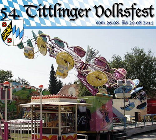 | 26. August - 30. August 2011 54. Volksfest @ Tittling Donnerstag, 26. August 2010 - Vorprogramm 19.00 Uhr Einlass zur V.O.P. 7 - Volksfest-Opening(Rock)-Party mit Hardbeat (Eintritt 3 €) Freitag, 27. August 2010 - Volksfesteröffnung 17.30 Uhr Standkonzert und Festzug vom Marktplatz mit Festwirt, Bürgermeister, Gemeinderat und Vereinen. Es spielt die Jugendblaskapelle Dreiburgenland Tittling 18.30 Uhr Eröffnung von unserem 1. Bürgermeister Waldemar Bloch 19.00 Uhr Wahl der Miss Volksfest Tittling 2010 21.00 Uhr Partyauftakt mit der Band Bayern Power Samstag, 28. August 2010 - Tittlinger Feierabend 15.00 Uhr Beginn des Festbetriebs ab 20.00 Uhr JUMP - Die unserRadio-Partyband aus dem schönen Bayerwald heizt allen ein! Sonntag, 29. August 2010 - Traditioneller Herbstkirta 11.00 Uhr Weißwurstfrühschoppen mit zünftiger, bodenständiger Volksmusik von DWaidler Musi ab 14.30 Uhr Kaffee und Kuchen vom Katholischen Frauenbund Tittling-Witzmannsberg 19.30 Uhr Stimmung im Festzelt mit der Partyband Undercover ca. 22.00 Uhr Auslosung der Volksfesttombola des FC Tittling e.V., Lospreis 1 € Montag, 30. August 2010 - Tag der Vereine und Betriebe ab 13.00 Uhr Kindernachmittag mit großem Luftballonwettbewerb Preise von Sparkasse Tittling und Markt Tittling - ermäßigte Preise bei den Fahrgeschäften. 14.00 bis 16.00 Uhr Altennachmittag für die Bürgerinnen und Bürger der Marktgemeinde Tittling und der Gemeinde Witzmannsberg mit Tanz und Musik. Für gute Stimmung sorgt Alleinunterhalter Erwin. 20.00 Uhr SaxnDi spielen auf! Freier Eintritt an allen Festtagen! |