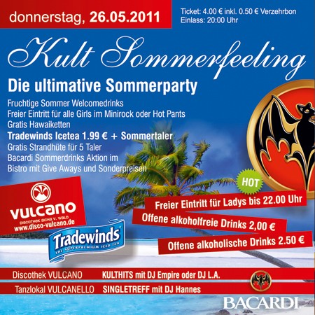 | 26. Mai 2011 Kult Sommerfeeling @ Vulcano Die ultimative Sommerparty. - Fruchtige Sommer Welcomedrinks. - Freier Eintritt für alle Girls im Minirock oder Hot Pants. - Freier Eintritt für Ladys bis 22.00 Uhr. - Gratis Hawaiketten. - Tradewinds Icetea 1.99 € + Sommertaler. - Gratis Strandhüte für 5 Taler. - Bacardi Sommerdrinks Aktion im Bistro mit Give Aways und Sonderpreisen. - Offene alkoholfreie Drinks 2,00 €. - Offene alkoholische Drinks 2.50 €. |