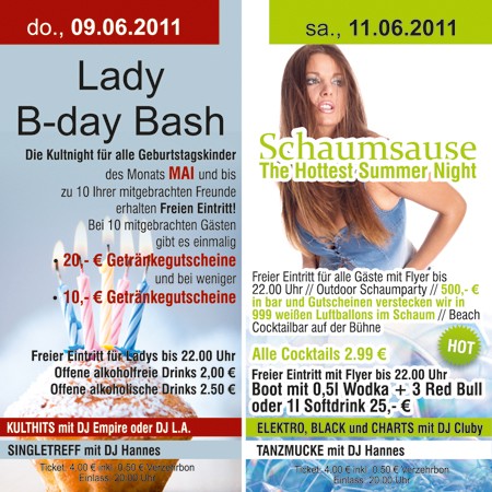 | 11. Juni 2011 Schaumsause @ Vulcano The Hottest Summer Night - Freier Eintritt für alle Gäste mit Flyer bis 22.00 Uhr - Outdoor Schaumparty - 500,- € in bar und Gutscheinen verstecken wir in 999 weißen Luftballons im Schaum - Beach Cocktailbar auf der Bühne. Getränkespecials: Alle Cocktails 2.99 €. Boot mit 0,5l Wodka + 3 Red Bull oder 1l Softdrink 25,- €. |