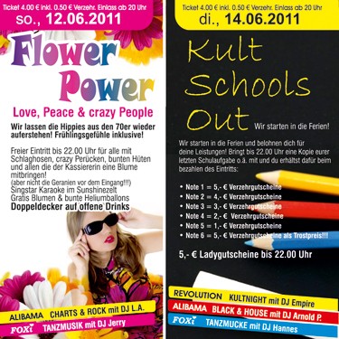 | 14. Juni 2011 Kult Schools Out @ Revolution Wir starten in die Ferien und belohnen dich für deine Leistungen! Bringt bis 22.00 Uhr eine Kopie eurer letzten Schulaufgabe oä mit und du erhältst dafür beim bezahlen des Eintritts: - Note 1 = 5,- Verzehrgutscheine. - Note 2 = 4,- Verzehrgutscheine. - Note 3 = 3,- Verzehrgutscheine. - Note 4 = 2,- Verzehrgutscheine. - Note 5 = 1,- Verzehrgutscheine. - Note 6 = 5,- Verzehrgutscheine als Trostpreis!!! 5,-€ Ladysgutscheine bis 22.00 Uhr |
