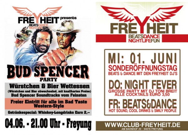 | freYheit - Der neue IN-Club in Freyung (Am Bahnhof 20, 94078 Freyung) 04.06.2011 - Bud Spencer Party - Würstchen & Bier Wettessen (Würstchen und Bier abwechselnd, mit knallharten Preise) - Freier Eintritt für alle im Bad Taste Western-Style - Getränkespecial: Whiskey-Longdrinks Euro 2,-- - Bud Spencer Soundtracks vom Feinsten Wochenprogramm (geöffnet von 21.00 Uhr bis 05.00 Uhr): Donnerstag: NIGHT FEVER- Das beste aus 40 Jahren Musikgeschichte, alle Cocktails 3,50 Euro Freitag: BEATS & DANCE - Nightlife deluxe, Club- und Partysound mit DJ HAGE Die kommenden Events an den Samstagen (jeweils von 21.00 Uhr bis 05.00 Uhr): 11.06.2011 - 90er Party - von peinlich bis geil, alles dabei - Doppeldeckerparty bis 23.00 Uhr (2 Getränke zum Preis von einem) www.club-freyheit.de info@club-freyheit.de |