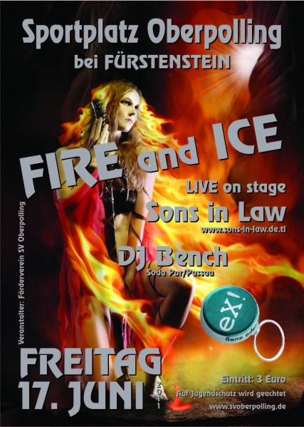 | Am 17. Juni 2011 in Oberpolling FIRE and ICE im Festzelt am Sportplatz in Oberpolling Dieses Jahr zum 1. Mal Live on Stage "Sons in Law"! und natürlich auch wieder dabei unser DJ Bench bekannt vom SODA PUR Club in Passau!! Zum Start des Oberpollinger Festes geht es wie die letzten Jahre auch wieder mit der Fire & Ice Ex-Party! des SV Oberpolling los! Wie auch die letzten Jahre gibt es wieder ein großes Zelt mit Bar und allem drum und dran! Ein muss für alle Jugendlichen & Erwachsenen! Der Eintritt beträgt 3 €! Kein Einlass unter 16 Jahren!(Ausweiskontrolle) Im Meetpoint eintragen, Kommen und Weitersagen! |