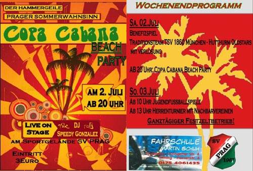 | 02. und 03. Juli 2011 Copa Cabana Beach Party Der Hammergeile Prager Sommerwahnsinn geht in die nächste Runde! Samstag02. Juli 2011: Benefizspiel: Traditionsteam TSV 1860 München - Hutthurmer Oldstars mit Verlosung ab ca 20:00 Uhr Copa Cabana Beach Party Live on Stage: DJ Speedy Gonzales Sonntag 03. Juli 2011 ab 10:00 Uhr Jugendspiele ab 13:00 Uhr Herrenturnier mit Nachbarvereinen GANZTÄGIGER FESTZELTBETRIEB!! |