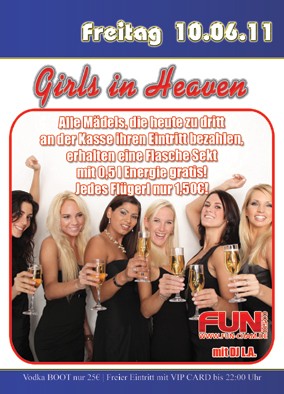 | 10. Juni 2011 Girls in Heaven@FUN Cham mit DJ L.A. Specials: Alle Mädels, die heut zu dritt an der kasse ihren Eintritt bezahlen, erhalten eine Flasche Sekt mit 0,5l Energie gratis! Jedes Flügerl nur 1,50 €. |