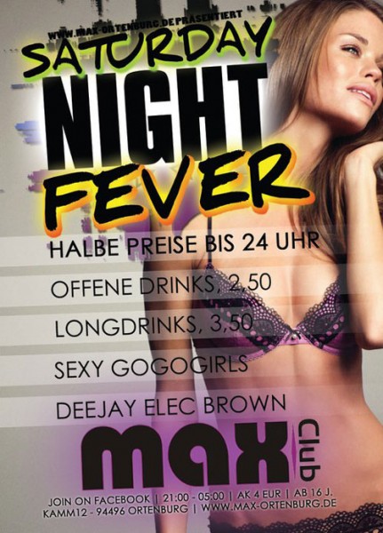 | 11. Juni 2011 Max Club in Ortenburg Saturday Night Fever @ Max Club Ab 16 Jahren (mit Formular auf www.Max-Ortenburg.de) Specials: - Halbe Preise bis 24 Uhr (wie gehabt) - Longdrinks 3,50 € - Goaßhalbe 4,00 € - Offene Getränke & Becks 2,50 € - Eintritt: 4 € - The best of Music all Style mit DJ Elec Brown (Passau) Auf euer kommen freut sich das gesammte MAX-CLUB Team |