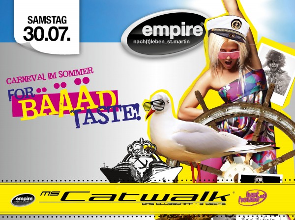 | 30. - 31. Juli 2011 MS CATWALK for BÄÄÄDDD TASTE HEMMuNGSloSES DuRcHDREHEN auf HoHER SEE… SO feiern wahre Seefahrer! DRESSCODE: Schrill – Schräg – Abgefahren… Alles ist erlaubt, Hauptsache verrückt! Alle im Bad-Taste-Outfit erhalten ein Begrüßungsgetränk ... 2 floors (electronic music deck & Party deck) RENE RODRIGEZZ - empire St. Martin Resident DJ www.rodrigezz.at DJ CABDRIVER - lusthouse Resident DJ DANY C ALAMANDO Warm UP: Ab 17.00 Uhr direkt an der Anlegestelle Boarding:: 18.00 Uhr Abfahrt: 19.00 Uhr Anlegestelle: Passau (Lindau / Grubweg) Transfer zur Anlegestelle: • Auto (genügend Parkplätze vorhanden) • Bus (ZOB - 17.00 - 17.30 - 18.00 - Linie 1 - Lindau) • Shuttlebusse aus Österreich (Fahrzeiten werden noch bekanntgegeben - Anmeldung unter office@empire.co.at) AFTER BOOTS PARTY – Havanna Lounge Shuttlebus Service *** Shuttlebus Service *** Tickets: EARLY BIRD TICKET: 19 EURO (nur bis 22.Juni) VVK TICKET: 23 EURO Ticketvorverkaufsstellen: EMPIRE ST.MARTIN * LUSTHOUSE HAAG * SKY PASSAU * ZIG ZAG STORE PASSAU* |