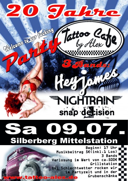 | 09. Juli 2011 ...wir werden 20...Tattoo Cafe Bodenmais Welcome to our fucking Party 3 Bands ab 17:00 Uhr Hey James - Nightrain - Snap Decision Musikbeitrag 5€ (inkl.1 Freilos) Verlosung im Wert von 500€ Grillstation bei Schlechtwetter rocken wir im Partyzelt und in der Grubenschänke |