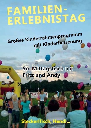 | 31. Juli 2011 Mittagstisch und Familien-Erlebnistag Frühschoppen mit Mittagstisch mit den Stimmungskanonen Fritz und Andy - STECKERLFISCH, Hendl, Pizza, Würstl, Bosner - Kinder- LUFTBALLONSTART - HÜPFBURG - Riesiger Sandspielplatz Das Fest findet bei jeder Witterung statt! Veranstalter: FF Hof Der Reinerlös dient dem Ankauf von Feuerwehrgeräten. |
