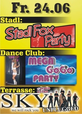 | 24. Juni 2011 FUN in Eggenfelden SKY @ FUN Stadl: Stadl Fox Party Dance Club: Mega GoGo Party Terrasse: SKY unplugged Gratis grillen! |
