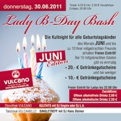 | 30. Juni 2011 Vulcano Aicha v. Wald Lady B-Day Bash @ Vulcano Die Kultnight für alle Geburtstagskinder des Monats JUNI und bis zu 10 Ihrer mitgebrachten Freunde erhalten Freien Eintritt! Bei 10 mitgebrachten Gästen gibt es einmalig • 20,- € Getränkegutscheine und bei weniger •10,- € Getränkegutscheine |