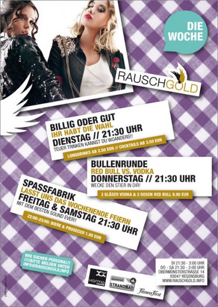 | 21. Juli 2011 BULLENRUNDE – RED BULL VS. VODKA Heute Nacht werden ganz besondere Runden gedreht! Eine Bullenrunde besteht aus einem Träger mit 3 Longdrinkgläsern inklusive Vodka und 2 Dosen Red Bull. Wecke den Stier in Dir! An den Decks DJ M-Beat! SPECIALS: jede Bullenrunde (3 Gläser mit Vodka + 2 Dosen Red Bull) nur 9,90 Euro jedes Kneitinger Pils nur 2,00 Euro |