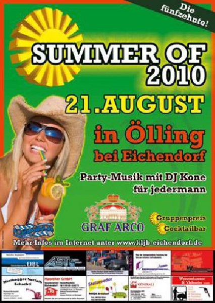 | 20. August - 21. August 2011 Summer of 2011 Auch heuer wieder findet das "Summer of" der KLJB Eichendorf-Pitzling statt. Für beste Stimmung sorgt die Liveband POP NACH 8. Bar, Cocktailbar und Grillstand sorgen für das leibliche Wohl. Auf die Jugendschutzbestimmungen wird geachtet |