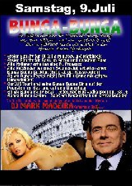 | 09. Juli 2011 Bunga Bunga Party @ FORUM In Italien brechen die Clubs bei Bunga Bunga aus allen Nähten!! und wie meistens kommt ihr im Forum als erstes in den Genuss dieses Spektakels !! Specials: • Freier Eintritt für Girls im Minirock und Highheels • Freier Eintritt für Boys im Anzug und gegeeltem Haar • Alle Italiener erhalten eine Fl. Prosecco • Alle Mitglieder bei einem Swingerclub erhalten einen Bunga Bunga Cocktail (Bitte an der Kasse outen ) • Bunga Bunga Fessel mich ! Das Flirt-Game mit echten Handschellen! • BerLUSTconi und seine Bunga Bunga Girls auf den Podesten , im Bett und auf dem Dancefloor • Bunga Bunga Party Boot Jedes Red Bull Vodka Boot nur 32€ • Bunga Bunga Casino Spiel am Rouletttisch um Getränkedollar Einheizen wird euch DJ Mark Madeira |