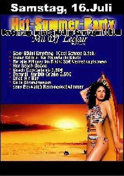 | 16. Juli 2011 Hot-Summer-Party@ FORUM Der Spritzige Splashige Samstag im Forum Specials: • Sexy Bikini Empfang (Cool-Schnee-Drink • Freier Eintritt für Mädels im Bikini • Für alle Männer im Bikini 20€ Verzehrgutschein • Hot Beach Gogos • Beach-Cocktails ab 3,50€ • Bacardi Caribik Drinks 2,50€ • Open Air Bar • Geile Strandmietzen • Sexy Baywatch-Rettungsschwimmer Am DJ Pult DJ Leclair ( Ralf Stenger) |