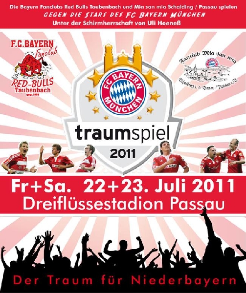 | Traumspiel 2011 Die Bayern Fanclubs Red Bulls Taubenbach und Mia san mia Schalding/Passau spielen gegen die Stars des FC Bayern München Unter der Schirmherrschaft von Uli Hoeneß Rahmenprogramm Freitag, 22. Juli: 19:00 Uhr: Abschlusstraining der beiden Fanclubs im Dreiflüssestadion ab 19:30 Uhr: "Warm Up" im großen Festzelt mit der bayrisch rockigen Profiband "Münchner G'schichten" EINTRITT FREI!!! Auf geht's - dabei sein!!! Gigantische Stimmung ist bei den sechs Jungs garantiert!!! Samstag, 23. Juli: 10:00 Uhr: Frühshoppen und Podiumsdiskussion im großen Festzelt Stargäste: Paul Breitner, Raimond Aumann, Django Asül, Stephan Lehmann 12:30 Uhr: Einlass ins Dreiflüssestadion Vorprogrogramm: Vorspiel Juniorenfußball A-/B-Jugend, verschiedene Showeinlagen, Vorstellung der Fanclub-Teams Live im Stadion: "ROOM 77" - Die Band von Ex-Bayern-Star Andi Görlitz mit Klassikern und neuen Songs ...und der Wahnsinn!!! - Ein extra komponierter "Traumspiel"-Hit 15:00 Uhr: Eintreffen der FC Bayern Stars 16:00 Uhr: Anpfiff zum Traumspiel 2011 ab 19:30 Uhr: "Enjoy the party" im großen Festzelt mit der "Highlife Liveband" EINTRITT FREI!!! |
