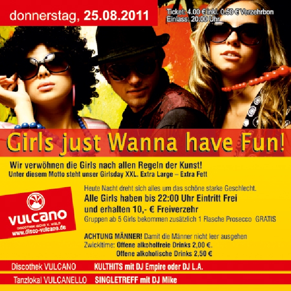 | 25. August 2011 Girls just Wanna have FUN @ Vulcano Girls just Wanna have Fun! Wir verwöhnen die Girls nach allen Regeln der Kunst! Unter diesem Motto steht unser Girlsday XXL. Extra Large – Extra Fett. Heute Nacht dreht sich alles um das schöne starke Geschlecht. Alle Girls haben bis 22:00 Uhr Eintritt Frei und erhalten 10,- € Freiverzehr. Gruppen ab 5 Girls bekommen zusätzlich 1 Flasche Prosecco GRATIS. ACHTUNG MÄNNER! Damit die Männer nicht leer ausgehen Zwickltime: Offene alkoholfreie Drinks 2,00 €. Offene alkoholische Drinks 2,50 € |