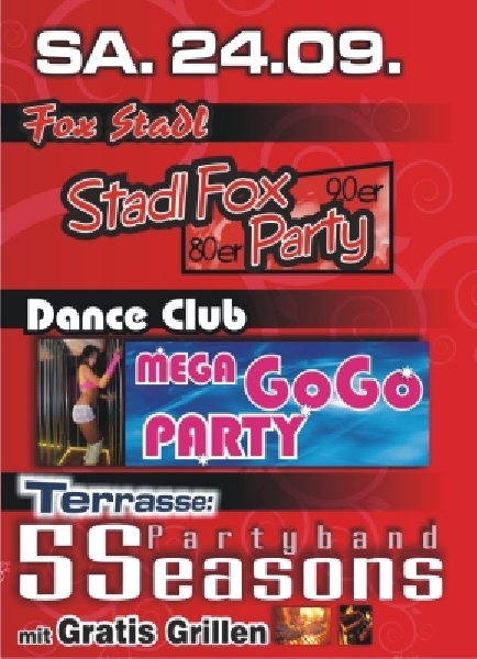 | Dance Club: Mega GoGo Party Stadl: Stadl Fox Party Terrasse: Partyband 5 Seasons live Gratis Grillen |