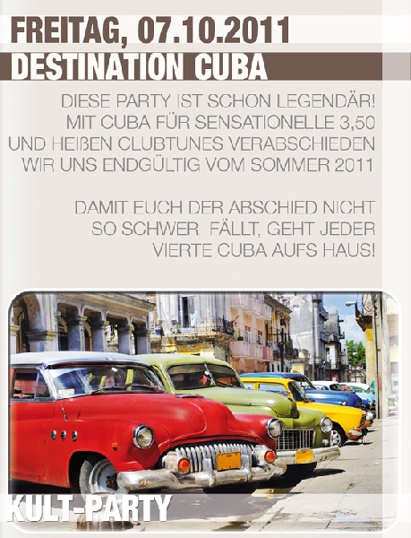 | DIESE PARTY IST SCHON LEGENDÄR! MIT CUBA FÜR SENSATIONELLE 3,50 UND HEIßEN CLUBTUNES VERABSCHIEDEN WIR UNS ENDGÜLTIG VOM SOMMER 2011 DAMIT EUCH DER ABSCHIED NICHT SO SCHWER FÄLLT, GEHT JEDER VIERTE CUBA AUFS HAUS! Mainarea: House/Electro/Black/Charts/Rock/Party/MashUps by Resident DJ RobRockz (www.facebook.com/dj.robrockz) Keller Music Club: House/HandsUp/Hardstyle/Electro/Black music/ MashUps by DJ John Taylor oder DJ Dany Kay |
