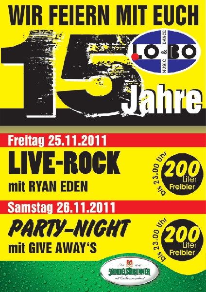 | WIR FEIERN MIT EUCH 15 JAHRE LOBO! Freitag, 25.11.2011 LIVE-ROCK mit RYAN EDEN Samstag, 26.11.2011 PARTY-NIGHT mit GIVE AWAY´S Special an beiden Tagen : Bis 23 Uhr gibts 200 Liter Freibier! ============================================================================== La Quinta: DJ Marcus !! - 70er, 80er & 90er abgemischt mit den aktuellen Charts !! Rockpub: Rock, Hardrock, Metall vom Feinsten ! SPECIAL im LA QUINTA : >Aperol Spritz ! >Ficken - der Partyschnapps ! >Cocktails !!! NEU: Wodka - Waldmeister EUR 2,00 |