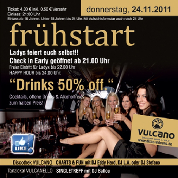 | Ladys feiert euch selbst!! Check in Early geöffnet ab 21.00 Uhr. Freier Eintritt für Ladys bis 22.00 Uhr. HAPPY HOUR bis 24:00 Uhr: “Drinks 50% off.“ Cocktails, offene Drinks & Alkoholfreies zum halben Preis! |