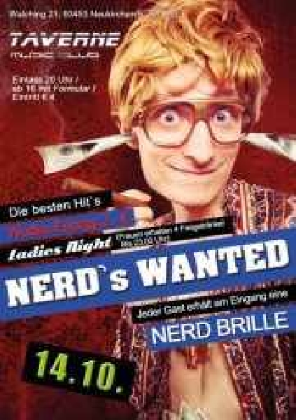 | NERD'S WANTED!!! Jeder Gast erhält am Eingang eine Nerd Brille!! Ladies Night (Frauen erhalten 4 Freigetränke bis 23.00 Uhr) Vodka Energy 2.- € |