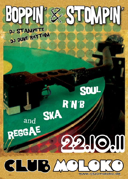 | DJ`s: Stampete & Duke Rhythm Eine Kultur – und Tanzveranstaltung die sich dem guten alten Sound verschrieben hat. Aufgelegt werden gute, alte und vor allem tanzbare Rhytmen: Rhythm’n’Blues, 50's und 60's Rock'n'Roll, Northern Soul, Early Reggae, traditional Ska und Rocksteady. http://www.myspace.com/boppinandstompin |