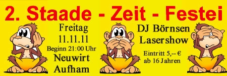 | 2.STAADE-ZEIT-FESTEI Eintritt: 5 Euro € Beginn: 21:00 Auf gehts zum 2.Staade-Zeit-Festei nach Aufham.. 2 Große Bars, Video-Grossleinwand, 2 DJ"s, Rock u.Pophits der Superlative bis hin zu den Chartknallern..Lasershow...Open end....Beginn 21.00 Uhr mit rockigen Grüßen euerm DJ Börnsen Super Getränkepreise |