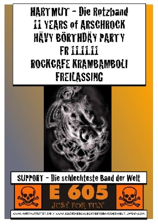| Eintritt: Frei € Beginn: 21:00 Nach fast genau zwei Jahren meldet sich HARTMUT - Die Rotzband pünktlich zum 11jährigen Bandjubiläum wieder zurück! Unter dem Motto "11 YEARS OF ASSROCK - HÄVY BÖRTHDÄY PARTY" bestreitet HARTMUT dieses freudige Ereignis. HARTMUT, mit dem Eber im Logo, steht für derb-rotzige bayrische Songtexte und Rockcover sowie eigenes Liedgut der speziellen Art! Da bleibt kein Auge trocken, quasi das Auge rot, die Leber hart - Eber Hartmut! Als Schmankerl der anderen Art im Handgepäck, sprich Vorprogramm, befindet sich eine weitere Kultband aus dem BGL, die nach 20 Jahren wiedervereinigten und berüchtigten Chaospunker E605! Die nach eigenen Angaben "Schlechteste Band der Welt" hat mittlerweile auch schon 25 Jahre auf dem Buckel. Dank dem Rockcafe Krambamboli und seinem neuen Wirt HP kommt dieses sagenhafte Package nun auf Bayerns Bühnen, damit der Eber kräftig dem Schweiße in seliger Clubatmosphäre huldigen kann und ordentlich die Schwarte krachen lässt! Erschwerend dazu kommt noch das perfekt zu diesem Event passende Datum mit FR, dem 11.11.11! Als Dank an die vielen treuen Fans, die nur alle paar Jahre etwas von Ihrer Band haben, erfolgt der Eintritt frei! |