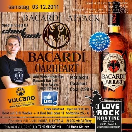 | 800 Welcomedrinks, Bacardi Bar mit Give Aways und Fotoecke. bacardi Oakheart Cola 2,99 €. Freier Eintritt mit Flyer bis 22:00 Uhr. Boot mit 0,5l Wodka und 3 RedBull oder 1l Softdrink 25,- €. Special Guest DJ Chiefattack. Freier Eintritt für alle Ladies die ganze Nacht. |