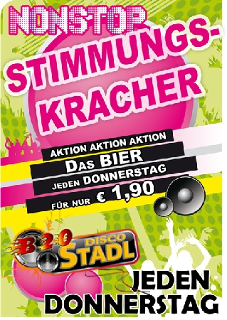 | Donnerstag, 15.12.2011 Stimmungskracher B20 Stadl Nähere Informationen Eintritt: 0,00 € Beginn: 21:00 Donnerstag Stimmungskracher Abfeiern mit den besten Party-Krachern und den heißesten Tracks aus den Charts - ein Hauch Mallorca-Stimmung im B20 Disco Stadl ... PS: Das Bier ab 1,90 Euro !!! |