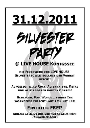 | Samstag, 31.12.2011 "SILVESTERPARTY" im LIVE HOUSE Nähere Informationen Eintritt: - € Beginn: 21:00 Silvester-Party mit Feuerwerk und LIVE HOUSE-Silvesterbowle, solange der Vorrat reicht! Aufgelegt wird Rock, Alternative, Metal und alle anderen harten Genres! Schlager, Pop, World... findet Ihr woanders! Rutscht laut rein mit uns! Keep' on rockin'! Euer LIVE HOUSE Team Doors: 21 Uhr AUSWEISPFLICHT |