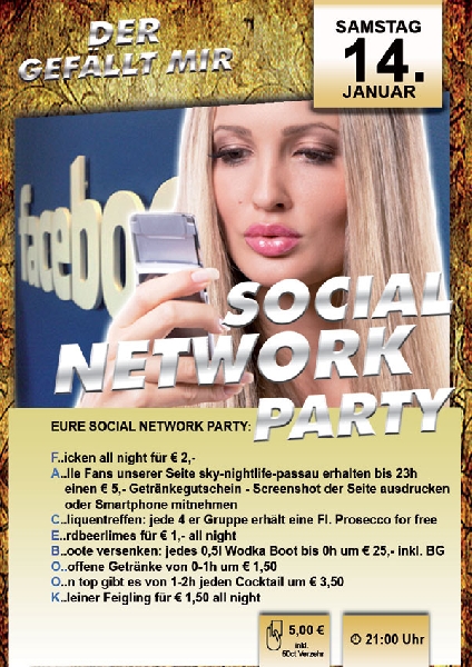 | EURE SOCIAL NETWORK PARTY: F..icken all night für € 2,- A..lle Fans unserer Seite sky-nightlife-passau erhalten bis 23h einen € 5,- Getränkegutschein - Screenshot der Seite ausdrucken oder Smartphone mitnehmen C..liquentreffen: jede 4 er Gruppe erhält eine Fl. Prosecco for free E..rdbeerlimes für € 1,- all night B..oote versenken: jedes 0,5l Wodka Boot bis 0h um € 25,- inkl. BG O..offene Getränke von 0-1h um € 1,50 O..n top gibt es von 1-2h jeden Cocktail um € 3,50 K..leiner Feigling für € 1,50 all night 21:00 h Ticket: € 5,- inkl. 50ct Verzehr |