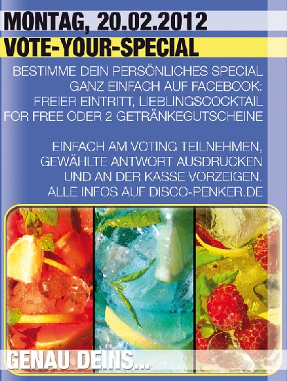 | BESTIMME DEIN PERSÖNLICHES SPECIAL GANZ EINFACH HIER AUF FACEBOOK: FREIER EINTRITT, LIEBLINGSCOCKTAIL FOR FREE ODER 2 GETRÄNKEGUTSCHEINE? EINFACH AM VOTING TEILNEHMEN, GEWÄHLTE ANTWORT AUSDRUCKEN UND AN DER KASSE VORZEIGEN. Hier geht's zum Voting: http://www.facebook.com/questions/187601624673341/?qa_ref=pt Musterausdruck (so sollte dein Ausdruck aussehen): http://www.discothek-penker.de/images/stories/misc/vote-your-special-ausdruck.jpg ----------------------------------------------------- MAINAREA: Deejay C-Moon & DJ RaZZ mehr Infos >> http://www.facebook.com/deejay.cmoon >> http://www.facebook.com/pages/-DJ-RaZZ-/124484337587837?ref=ts |