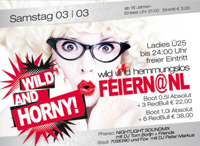 | Wild And Horny! Wild und Hemmungslos Feiern@Nl Ladies Ü25 bis 24:00 Uhr freier Eintritt Boot 0,5l Absolut + 3 RedBull € 22,00 Boot 1,0l Absolut + 6 RedBull € 38,00 Pharao : Nightlight Soundmix mit DJ TOM BORIJN & Friends Stadl : Fox, 70, 80, 90 und Party mit DJ PETER MARKUS ab 16 Jahren | Einlass Uhr 21:00 | Eintritt € 3,00 Aufsichtspflichtformular : http://documents.nightlight-innernzell.de/documents/NL_Aufsichtspflicht_Formular.pdf |