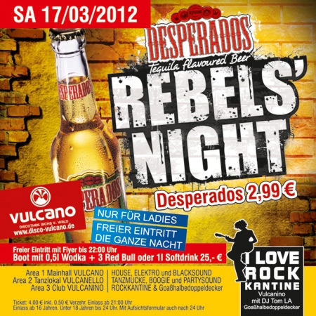 | DESPERADOS REBELS NIGHT Desperados 2,99 €. NUR FÜR LADIES: FREIER EINTRITT DIE GANZE NACHT. Freier Eintritt mit Flyer bis 22:00 Uhr. Boot mit 0,5l Wodka + 3 Red Bull oder 1l Softdrink 25,- €.,- €. |
