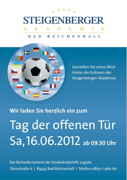 | Tag der offenen Tür Die Steigenberger Akademie im Fußball-Fieber Am Samstag, 16. Juni 2012, ist es wieder soweit! Sie sind herzlich zum Tag der offenen Tür eingeladen. Seit Jahren beliebt und in diesem Jahr ganz im Zeichen der Europameisterschaft unter dem Motto: „Anpfiff" zum Tag der offenen Tür Genießen Sie einen erlebnisreichen Tag. Das Programm: ab 10.00 Uhr Frühschoppen mit der Bad Reichenhaller Stadtkapelle Über den Tag verteilt präsentieren Schüler der Akademie praktisches Arbeiten Blick hinter die Kulissen der Akademie und der IUBH Das Bayerische Rote Kreuz Teisendorf zeigt seinen Einsatzwagen, das Einsatzquad und das Küchenzelt mit Küchenanhänger Hüpfburg, Spiel, Spaß und mehr sind für unsere kleinen Gäste geboten ...viele weitere Highlights Kulinarisches: 6-Gang-Themenmenü im Schulrestaurant oder auf der Terrasse frisch gezapftes Bier und bayerische Schmankerl im Biergarten Grillspezialitäten an der Grillstation Kaffee und Kuchen am Nachmittag Cocktails und ausgesuchte Getränke an der Cocktailbar Seien auch Sie dabei! Genießen wir gemeinsam einen schönen Sommertag - wir freuen uns auf Sie! Der Reinerlös dieses Tages fließt der Kinderkrebshilfe zu. Also, bis zum 16. Juni. Die angehenden Hotelbetriebswirte 2011/ 13 |