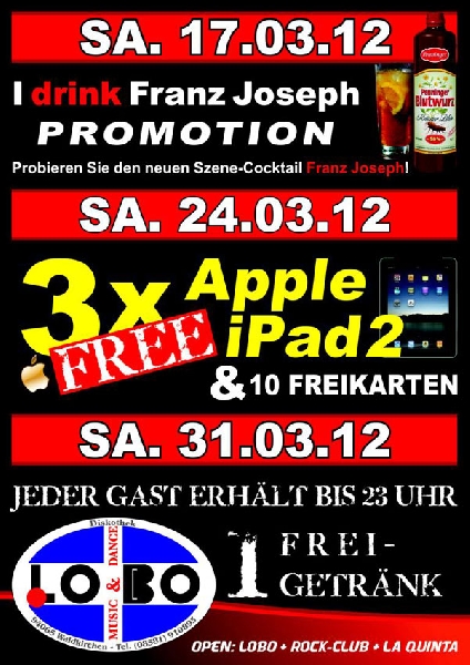 | Doors open: 8 p.m. Lobo: DJ L.A. - House, Dance, Electro, Black, Hip Hop & aktuelle Charts .... La Quinta: DJ Markus - 70er, 80er, 90er & aktuelle Charts .... Rockclub: DJ Herbie oder DJ Fuchsi - Rock, Metall ... die harten Sachen ! Wir verlosen heute 3x Apple iPad2 & 10 Freikarten SPECIALS: Wodka Waldmeister - EUR 2 Captain Cola - EUR 2,50 Bacardi Razz - EUR 2,50 Ficken - EUR 2,50 Und die leckeren Cocktails gibts wie immer im LA QUINTA !! |