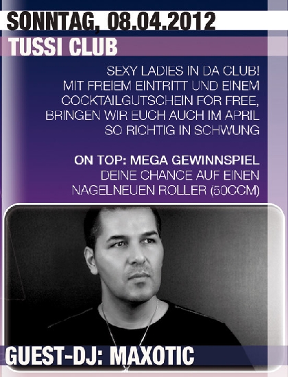 | SEXY LADIES IN DA CLUB! MIT FREIEM EINTRITT UND EINEM COCKTAILGUTSCHEIN FOR FREE, BRINGEN WIR EUCH AUCH IM APRIL SO RICHTIG IN SCHWUNG ON TOP: MEGA GEWINNSPIEL DEINE CHANCE AUF EINEN NAGELNEUEN ROLLER (50CCM) ---------------------------------------------------- MAINAREA: Guest-DJ Maxotic Fan-Page: http://www.facebook.com/DeejayMaxotic |