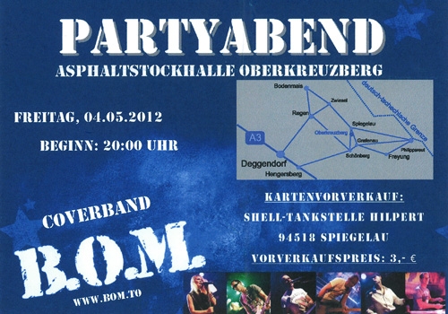 | Mit der Band B.O.M. in der Veranstaltungshalle Oberkreuzberg. B.O.M. ist eine der besten Coverbands in Österreich. Los gehts um 20:00 Uhr Kartenvorverkauf: Shell-Tankstelle Hilpert in 94518 Spiegelau Vorverkaufspreis: 3,00 Euro Für alle unter 18 Jahren: Kommst Du in Begleitung einer „erziehungsberechtigten Person“, vergiss das Jugendschutzformular nicht: Link zum JUGENDSCHUTZFORMULAR INFOS ZU BAND: BOM steht bei uns in Österreich schon lange als Synonym für Party – Unterhaltung – Stimmung. Schon seit einiger Zeit haben wir auch die Herzen unserer bayrischen Freunde erobert. Einige Auftritte absolvierten wir hier schon sehr erfolgreich. BOM ging aus der kleinen Tanzband Malibu hervor. Im Zuge der Umstrukturierung auf eine Partyband wurde die Band auf BOM getauft. Denn da wir auf Grund unserer Musik anscheinend nicht altern, hießen wir seither Boys Of Malibu. Wie auch der Name, wurde unser Programm total umgestellt. Jeder Auftritt richtet sich nach unserem Publikum. Ob Oldies, Rock, Stimmung oder die aktuellen Dancefloor-Charts. Fast alles ist dabei. Auch gibt es unter den vielen kleinen Bühneshows einen eigenen Showblock, der automatisch bei fast jedem Auftritt aufgeführt wird. Daher sind wir in der Lage einen kleinen Faschingsball genauso zu spielen, wie eine Zeltfestparty, Ballermannparty oder Volksfest. Die Besetzung ist klassisch aufgebaut: Sängerin Barbara aus München, Bassist und Conférencier Roland, Keyboards Peter und Maxx, Gitarrist Chris, Schlagzeuger Charly. Außer dass jeder sein Instrument so halbwegs im Griff hat, singt auch noch jeder dazu mit. Die Vielfältigkeit unserer Songs sei nochmal hier durch einen kleinen Auszug dargestellt: Ai se eu te pego (Michel Teló), Fliegerlied (Die Zillertaler), Party Rock Anthem (LMFAO), Viva Colonia (Die Höhner), Die besten sterben jung (Die böhsen Onkelz), Tulpen aus Amsterdam, Born This Way (Lady GAGA), On The Floor (JLo), Hollywood Hills (Sunrise Avenue), I sing a Liad fir di (Gabalier), The Time (Black Eyed Peas), Highway To Hell (AC/DC), Joana (Peter Wackel)… Weitere Infos auch unter: www.bom.to |