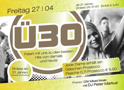 | Ü30 Party Feiert mit uns zu den besten Hits von damals und heute! Jede Dame erhält ein Glässchen Prosecco Flasche 0,7 l Prosecco € 9,90 EINLASS ab 21 Jahren ! ( Ausweis bereithalten! ) Pharao : Ü30 Mixed Music mit DJ PETER MARKUS ab 21 Jahren | Einlass Uhr 21:00 | Eintritt € 3,00 |