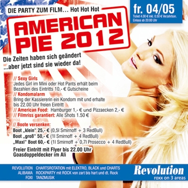 | American Pie 2012 DIE PARTY ZUM FILM… Hot Hot Hot. Die Zeiten haben sich geändert ...aber jetzt sind sie wieder da! // Sexy Girls Jedes Girl im Mini oder Hot Pants erhält beim Bezahlen des Eintritts 10,- € Gutscheine // Kondomalarm Bring der Kassiererin ein Kondom mit und erhalte bis 22.00 Uhr freien Eintritt // American Food: Hamburger 1,- € und Pizzaecken 2,- € // Filmriss garantiert: Alle Shots 1.50 €. // Boote versenken: Boot „klein“ 25,- € (0,5l Smirnoff + 3 RedBull). Boot „groß“ 50,- € (1l Smirnoff + 4 RedBull). „Maxi“ Boot 60,- € (1l Smirnoff + 0,7l Prosecco + 4 RedBull). reier Eintritt mit Flyer bis 22.00 Uhr Goasdoppeldecker im Ali. |