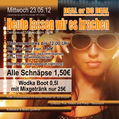 | Heute lassen wir es krachen! Dein neuer Mittwoch im FUN Welcomedrinks bis 22 Uhr Becks Gold nur 1,50 Euro Für die ersten 10 Gäste, die den Eintritt bezahlen, gibt es einen 5 Euro Getränkegutschein Alle Schnäpse 1,50 Euro Wodka Boot 0,5 l mit Mixgetränk nur 25 Euro |